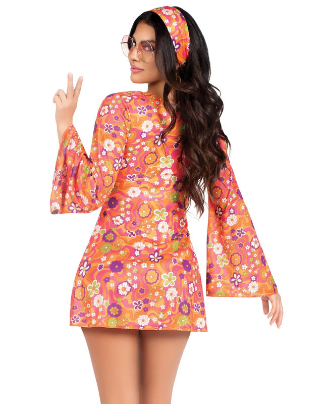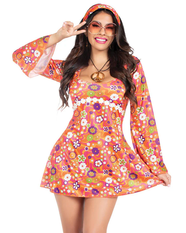 Includes: bell sleeve empire waist dress, head scarf, fringe leg warmers, peace sign necklace, earrings, and sunglasses.